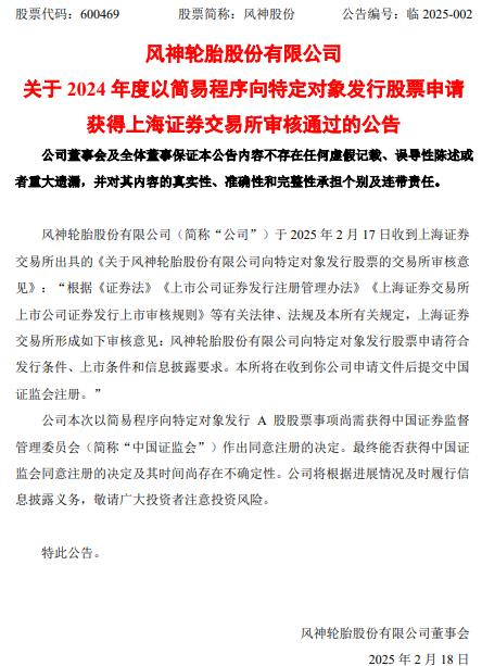 中国经济网北京2月18日讯 风神股份(600469.SH)昨晚披露关于2024年度以简易程序向特定对象发行股票申请获得上海证券交易所审核通过的公告。