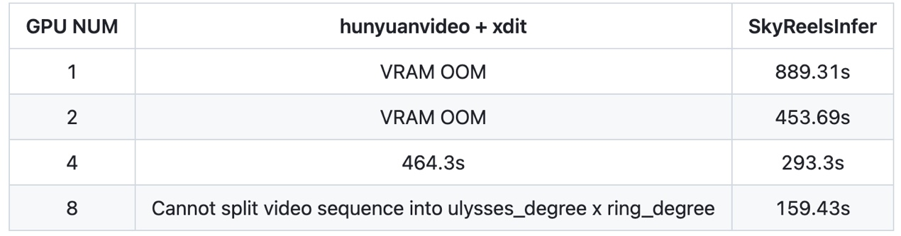 图3丨推理生成544p视频,SkyReels-Infer版本具备更鲁棒的多卡部署策略,支持8卡部署