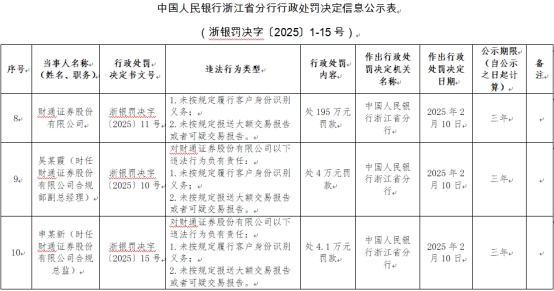 中国经济网北京2月18日讯 中国人民银行浙江省分行网站昨日公布的行政处罚决定信息公示表(浙银罚决字〔2025〕10号、11号、15号)显示,财通证券股份有限公司未按规定履行客户身份识别义务;未按规定报送大额交易报告或者可疑交易报告。中国人民银行浙江省分行对其处195万元罚款。