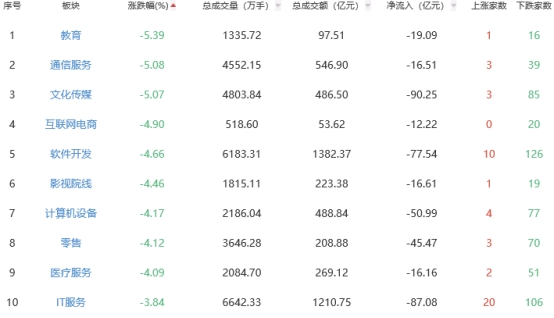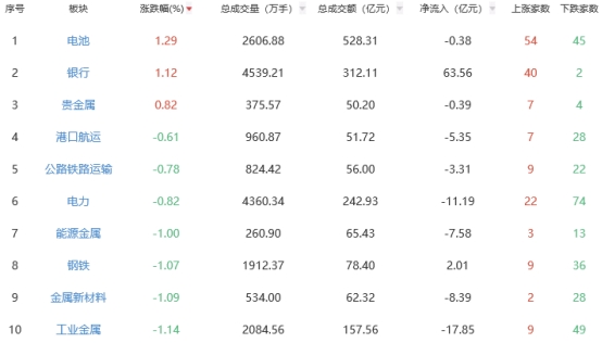 板块方面,电池、银行、贵金属板块上涨,教育、文化传媒、通信服务等板块跌幅居前。