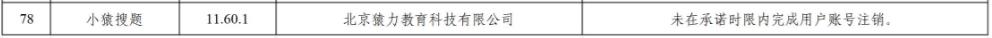 依法责令限期整改的78款App中,运营者为北京猿力教育科技有限公司的APP小猿搜题(版本号:11.60.1)存在的主要问题是未在承诺时限内完成用户账号注销。