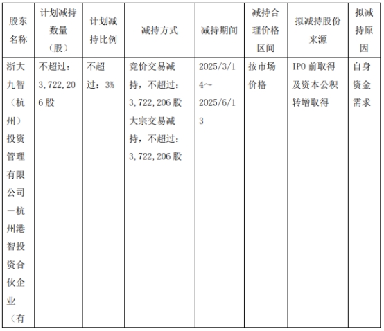 中国经济网北京2月21日讯 禾迈股份(688032.SH)昨晚披露的关于持股5%以上股东减持股份计划的公告显示,公司股东浙大九智(杭州)投资管理有限公司-杭州港智投资合伙企业(有限合伙)(以下简称“港智投资”)计划在减持计划披露之日起15个交易日后的三个月内,即2025年3月14日至2025年6月13日,以集中竞价和大宗交易的方式合计减持不超过3,722,206股公司股票,合计减持比例不超过公司总股本的3%。