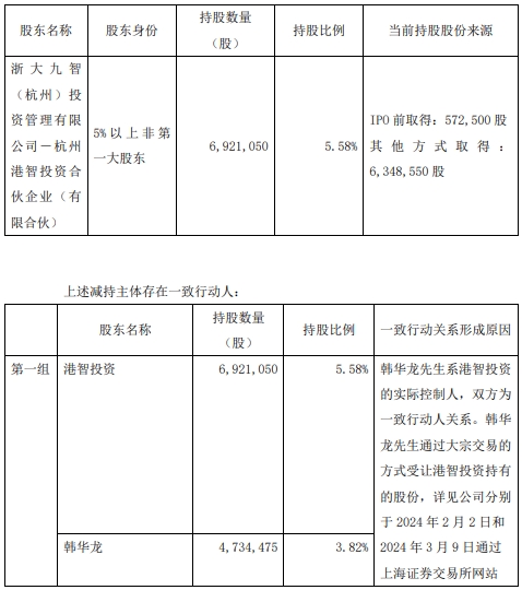 截至公告披露日,港智投资及其一致行动人韩华龙合计持有禾迈股份11,655,525股,股份性质均为A股,占公司总股本124,073,545股的9.39%。其中,港智投资持有6,921,050股,占公司总股本的5.58%,韩华龙持有4,734,475股,占公司总股本的3.82%。