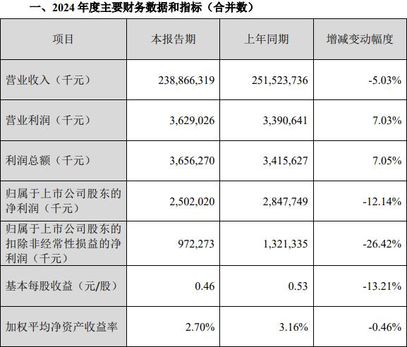 中国经济网北京2月21日讯 金龙鱼(300999.SZ)19日晚披露2024年度业绩快报,报告期内,公司实现营业收入2,388.66亿元,同比下降5.03%;利润总额36.56亿元,同比增长7.05%;归属于上市公司股东的净利润25.02亿元,同比下降12.14%;归属于上市公司股东的扣除非经常性损益的净利润9.72亿元,同比下降26.42%。