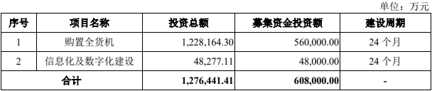 南航物流原拟募集资金608,000.00万元,分别用于购置全货机、信息化及数字化建设。