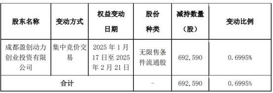 2025年1月17日至2025年2月21日,盈创动力通过集中竞价交易方式减持公司股份692,590股,减持比例为0.6995%。