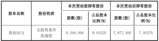 本次权益变动后,盈创动力持有公司股份数量由8,569,996股减少至7,877,406股,占公司总股本比例由8.6552%减少至7.9557%。
