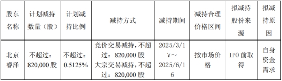 公司股东北京睿泽拟通过集中竞价、大宗交易的方式减持所持公司股份,减持股份数量合计不超过820,000股,拟减持比例不超过公司总股本的0.5125%(若计划减持期间公司有送股、资本公积金转增股本等股份变动事项,上述股份数量做相应调整)。上述减持自公告披露之日起15个交易日后的3个月内进行。