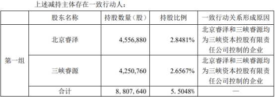 截至公告披露日,公司股东北京睿泽持有公司股份4,556,880股,占公司总股本的比例为2.8481%;三峡睿源创新创业股权投资基金(天津)合伙企业(有限合伙)(以下简称“三峡睿源”)持有公司股份4,250,760股,占公司总股本的比例为2.6567%。北京睿泽与三峡睿源构成一致行动人关系均为三峡资本控股有限责任公司(以下简称“三峡资本”)控制的企业,在本次减持计划实施前合计持有公司股份8,807,640股,占公司总股本的比例为5.5048%。