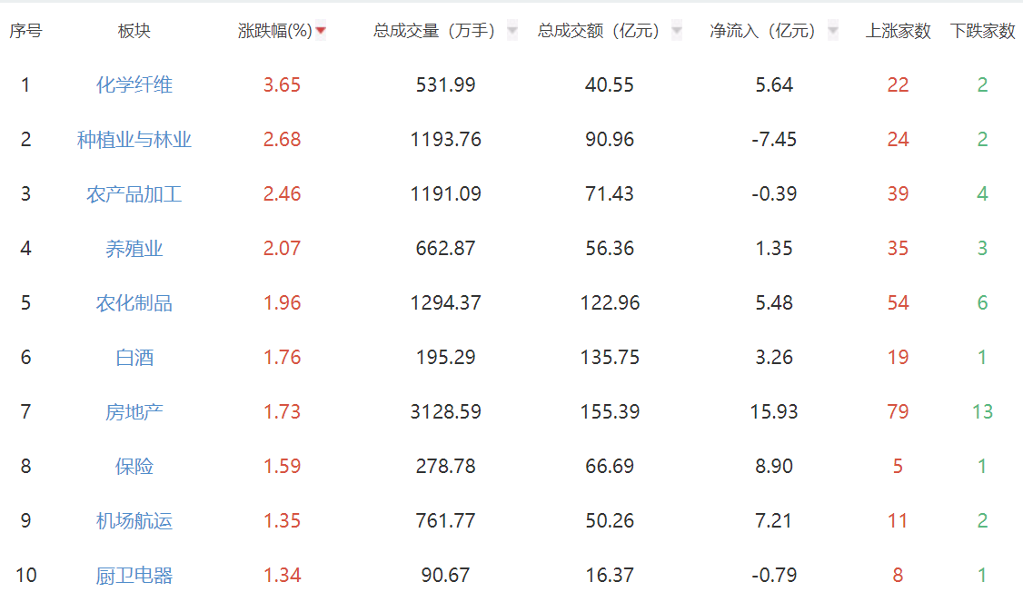 板块方面,化学纤维、种植业与林业、农产品加工等涨幅居前,元件、医疗服务、游戏等跌幅居前。