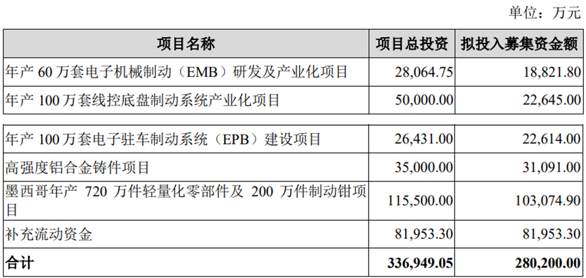伯特利2024年10月25日披露的关于向不特定对象发行可转换公司债券预案(修订稿)显示,公司本次发行的可转债募集资金总额不超过人民币280,200.00万元(含280,200.00万元),扣除发行费用后,募集资金净额将用于年产60万套电子机械制动(EMB)研发及产业化项目、年产100万套线控底盘制动系统产业化项目、年产100万套电子驻车制动系统(EPB)建设项目、高强度铝合金铸件项目、墨西哥年产720万件轻量化零部件及200万件制动钳项目、补充流动资金。