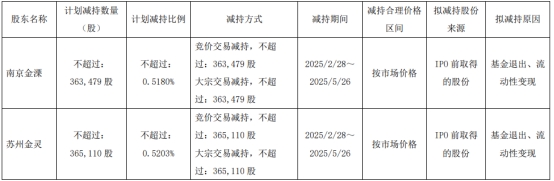 南京金溧、苏州金灵计划减持数量为不超过363,479股、不超过365,110股,计划减持比例不超过0.5180%、不超过0.5203%。二者拟减持数量合计不超728,589股,拟减持原因均为基金退出、流动性变现。拟减持股份来源均为IPO前取得的股份。