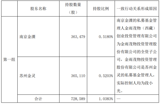 据近岸蛋白公告,南京金溧和苏州金灵为一致行动人关系,共计持有公司728,589股股份,合计占公司总股本比例为1.0383%。