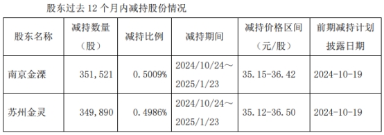 此前,2024年10月24日至2025年1月23日,南京金溧、苏州金灵分别减持近岸蛋白351,521股、349,890股,减持比例分别为0.5009%、0.4986%。前者减持价格区间为35.15元/股至36.42元/股,后者减持价格区间为35.12元/股至36.50元/股。
