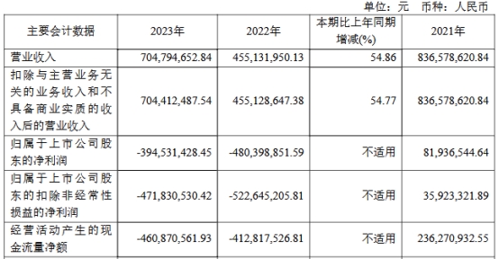 2022年、2023年,百奥泰营业收入分别为4.55亿元、7.05亿元,归属于上市公司股东的净利润分别为-4.80亿元、-3.95亿元,归属于上市公司股东的扣除非经常性损益的净利润分别为-5.23亿元、-4.72亿元。