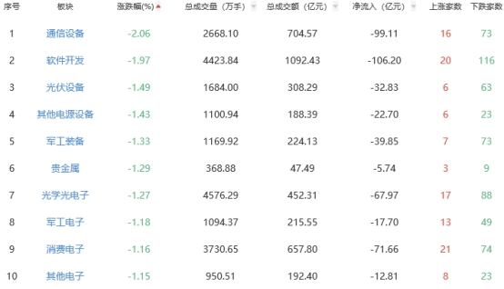 板块方面,饮料制造、电池、零售等板块涨幅居前,通信设备、软件开发、光伏设备等板块跌幅居前。