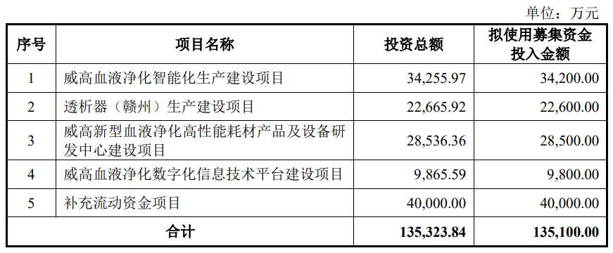 威高血净拟募集资金135,100.00万元,用于威高血液净化智能化生产建设项目、透析器(赣州)生产建设项目、威高新型血液净化高性能耗材产品及设备研发中心建设项目、威高血液净化数字化信息技术平台建设项目、补充流动资金项目。