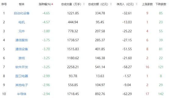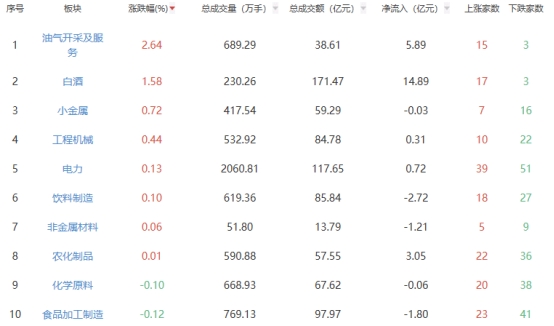 板块方面,油气开采及服务、白酒、小金属等板块涨幅居前,自动化设备、电机、元件等板块跌幅居前。