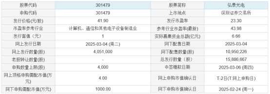 弘景光电2025年3月3日披露的首次公开发行股票并在创业板上市发行公告显示,按本次发行价格41.90元/股计算,公司募集资金总额预计为66,565.13万元,扣除预计发行费用约7,192.55万元(不含增值税)后,预计募集资金净额约为59,372.58万元。