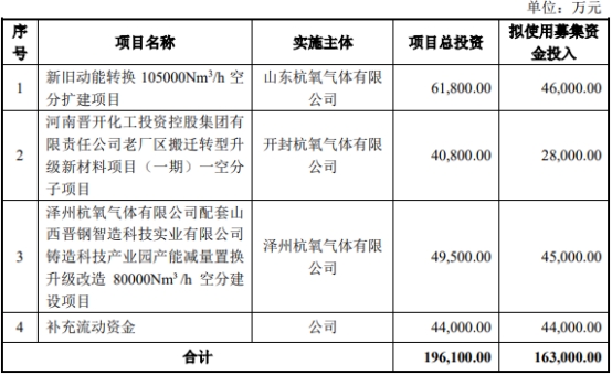 本次发行募集资金总额不超过16.30亿元(含本数),扣除发行费用后全部用于以下项目:新旧动能转换105000Nm3/h空分扩建项目、河南晋开化工投资控股集团有限责任公司老厂区搬迁转型升级新材料项目(一期)一空分子项目、泽州杭氧气体有限公司配套山西晋钢智造科技实业有限公司铸造科技产业园产能减量置换升级改造80000Nm3/h空分建设项目、补充流动资金。