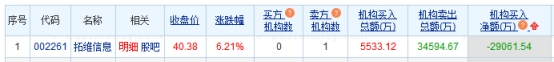 龙虎榜数据显示,卖出拓维信息金额最大的前5名中,1家为机构专用席位。经统计,机构席位今日卖出拓维信息净额为29061.54万元。