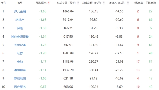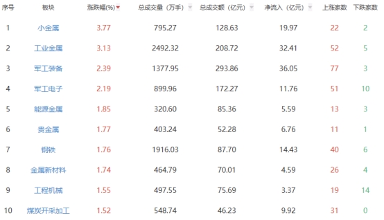板块方面,小金属、工业金属、军工装备等板块涨幅居前,多元金融、房地产、保险等板块跌幅居前。