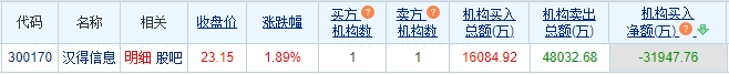龙虎榜数据显示,今日,买入汉得信息金额最大的前五名中,有1家机构专用席位;卖出汉得信息金额最大的前五名中,有1家机构专用席位。经统计,汉得信息的机构席位今日净卖出金额为31947.76万元。