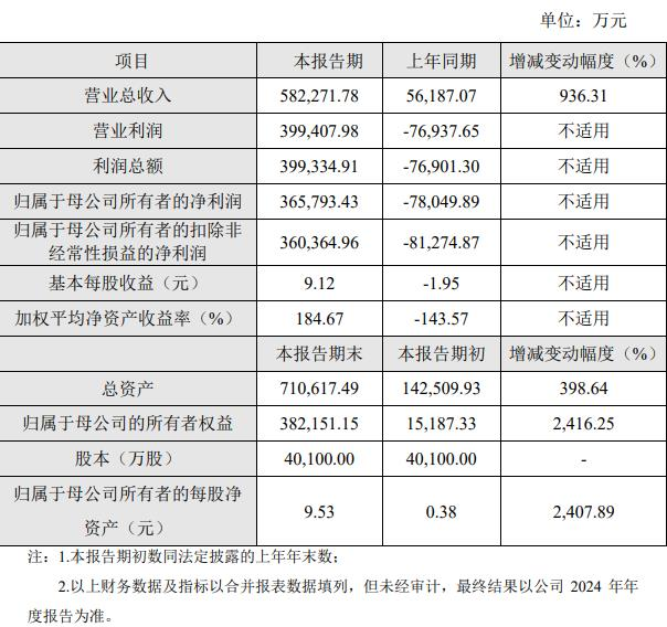 据公司2024年年度业绩快报公告,报告期内,公司实现营业总收入582,271.28万元,同比增长936.31%;实现归属于母公司所有者的净利润365,793.43万元,较上年同期增加443,843.32万元;归属于母公司所有者的扣除非经常性损益的净利润360,364.96万元,较上年同期增加441,639.83万元。报告期末,公司总资产为710,617.49万元,较年初增长398.64%;归属于母公司的所有者权益为382,151.15万元,较年初增长2,416.25%。