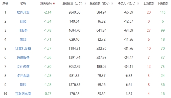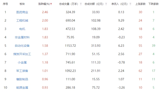 板块方面,医药商业、工程机械、电机等板块涨幅居前,软件开发、保险、IT服务等板块跌幅居前。