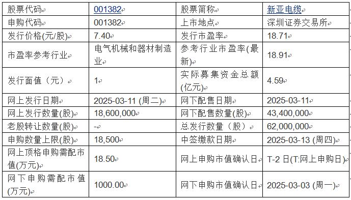 2025年3月10日,新亚电缆发布的首次公开发行股票并在主板上市发行公告显示,若本次发行成功,公司募集资金总额预计为45,880.00万元,扣除预计约5,808.73万元(不含增值税,含印花税)的发行费用后,预计募集资金净额为40,071.27万元。
