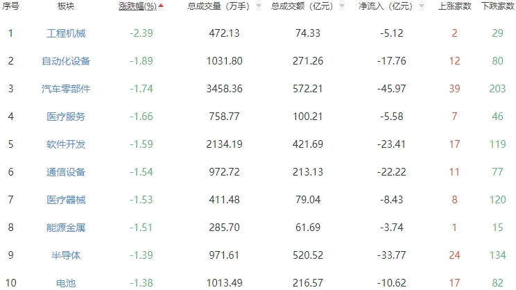 板块方面,军工电子、白酒、贸易等板块涨幅居前,工程机械、自动化设备、汽车零部件等板块跌幅居前。