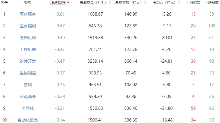 板块方面,军工电子、小金属、美容护理等板块涨幅居前,医疗服务、医疗器械、通信设备等板块跌幅居前。