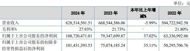据公司2024年年报,2024年,公司实现营业收入6.29亿元,同比减少5.99%;归属于上市公司股东的净利润1.09亿元,同比增长37.02%;归属于上市公司股东的扣除非经常性损益后的净利润1.01亿元,同比增长35.11%,经营活动产生的现金流量净额1.22亿元,同比增长84.85%。