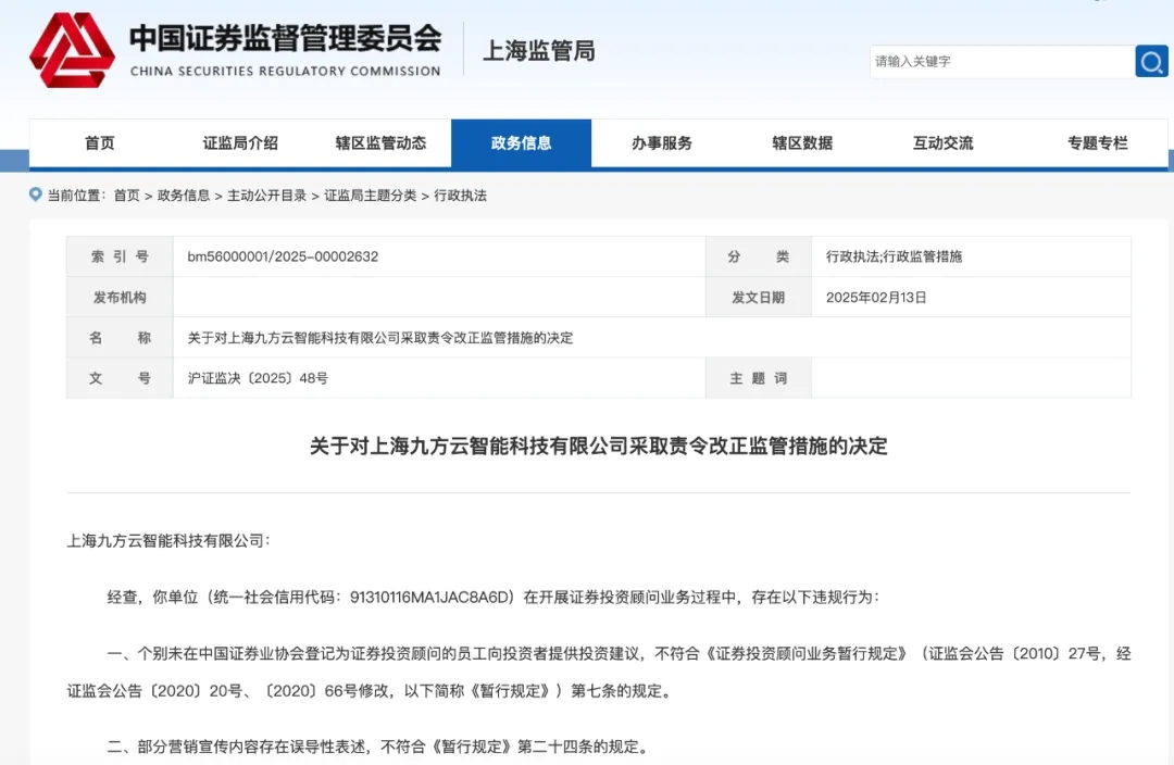 消费日报网讯(记者 卢岳)近期,上海证监局一口气披露4张投顾公司罚单。其中针对上海九方云智能科技有限公司(下称“九方智投”)下发的监管措施决定书显示,经查,九方智投在开展证券投资顾问业务过程中,存在部分营销宣传内容存在误导性表述等违规行为,该局决定对其采取责令改正的监管措施。