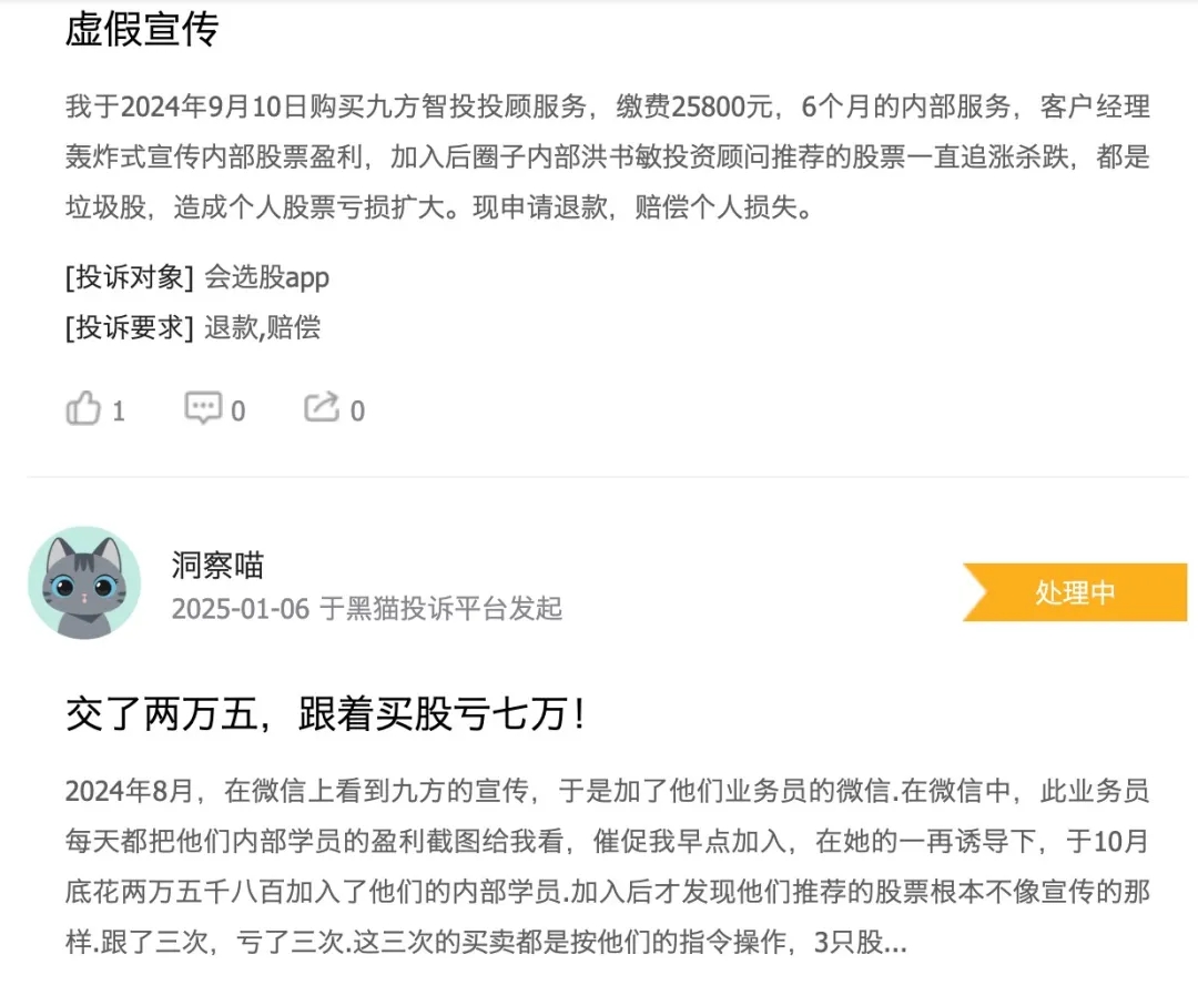 误导性的营销宣传首先给九方智投带来大量的消费投诉。黑猫投诉平台信息显示,不少消费者反映,九方智投的工作人员通过微信、电话宣传其荐股服务时,通常通过展示盈利案例等,营造“推荐的股票都在暴涨”的虚假氛围。消费者实际购买服务后,发现所推荐的股票并未如宣传所示带来盈利,反而造成巨大亏损。