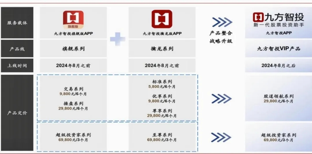 记者获悉,近期九方智投对旗下产品进行了升级整合,旗舰版和擒龙版两个APP合为“九方智投”app,两款产品也整合为两个主要系列——29800元/6个月的股道领航系列,及69800元/3个月的超级投资专家系列。此外,原本主营高端投教对九方智投还推出了多款小额产品,并拓展硬件业务,推出了“易知股道”学习机。
