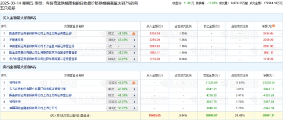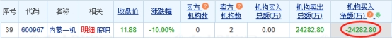 龙虎榜数据显示,内蒙一机卖出金额最大的前五名中,有2家机构专用席位。经统计,内蒙一机的机构席位今日净卖出金额为24282.80万元。