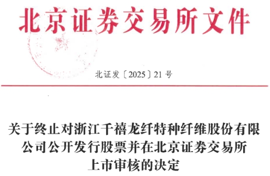 北交所于2023年11月24日受理了千禧龙纤提交的公开发行相关申请文件,并按照规定进行了审核。2025年2月24日,千禧龙纤向北交所提交了《浙江千禧龙纤特种纤维股份有限公司关于撤回向不特定合格投资者公开发行股票并在北京证券交易所上市申请文件的申请报告》,申请撤回申请文件。根据《北京证券交易所向不特定合格投资者公开发行股票并上市审核规则》第五十五条的有关规定,北交所决定终止千禧龙纤公开发行股票并在北京证券交易所上市的审核。