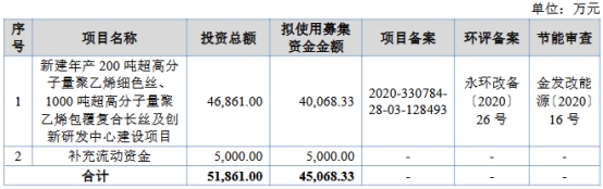 公司原拟募集资金45,068.33万元,用于“新建年产200吨超高分子量聚乙烯细色丝、1000吨超高分子量聚乙烯包覆复合长丝及创新研发中心建设项目”“补充流动资金”。