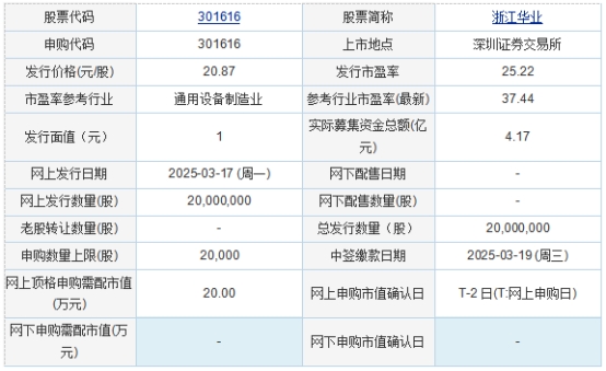 浙江华业2025年3月14日披露的首次公开发行股票并在创业板上市发行公告显示,按本次发行价格20.87元/股,公司预计募集资金总额为41,740.00万元,扣除预计发行费用6,107.65万元(不含增值税)后,预计募集资金净额为35,632.35万元。