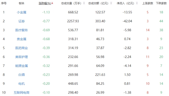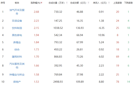 板块方面,油气开采及服务、环保设备、饮料制造等板块涨幅居前,小金属、证券、医疗服务等板块跌幅居前。