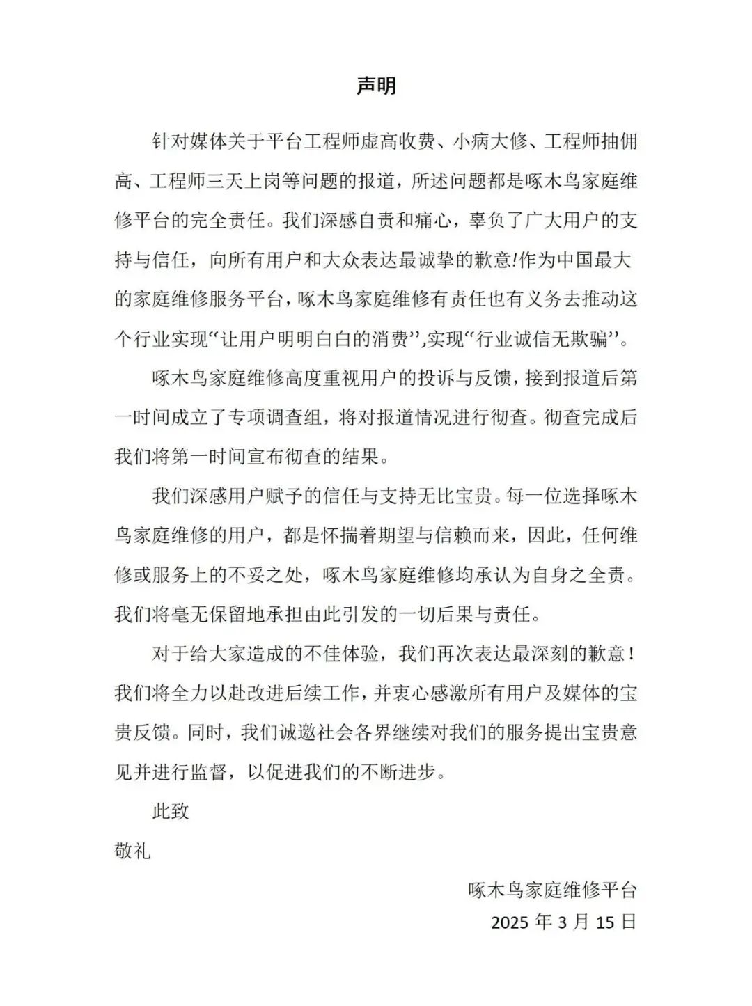 3月15日,2025年央视315晚会曝光一系列行业乱象。其中点名,啄木鸟家庭维修平台无病乱修、小病大修、乱收费,坑骗消费者。