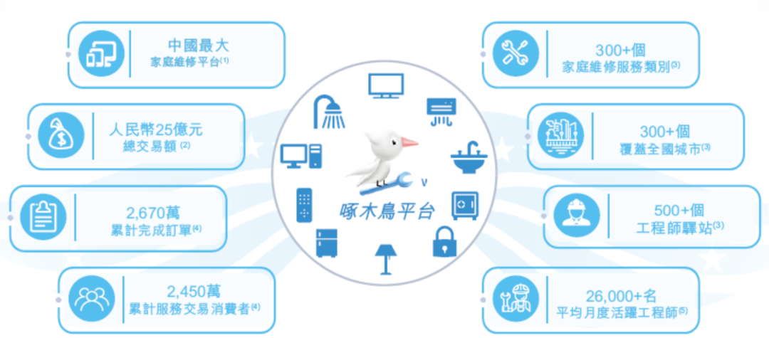 啄木鸟家庭维修创始于1995年,创始人兼董事长王国伟从一线维修工人开始其职业生涯。如今,啄木鸟提供的服务已覆盖逾300个主要家电和家居设施类别,包括家电维修、防水补漏、家具维修以及电子产品(如手机及笔记本计算机)维修等。2023年前9个月,啄木鸟平台总交易额约为人民币17.9亿元,较2022年同期增长65.7%。
