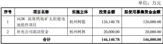 本次向特定对象发行股票拟募集资金总额不超过146,000.00万元(含本数),扣除发行费用后,将用于1GW高效钙钛矿太阳能电池组件项目、补充公司流动资金。