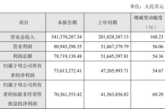 据公司2024年年度业绩快报公告,报告期内,公司实现营业总收入541,370,287.34元,同比增加168.23%;实现归属于母公司所有者的净利润73,013,272.41元,同比增加54.67%;实现归属于母公司所有者的扣除非经常性损益的净利润70,361,553.42元,同比增加69.29%。