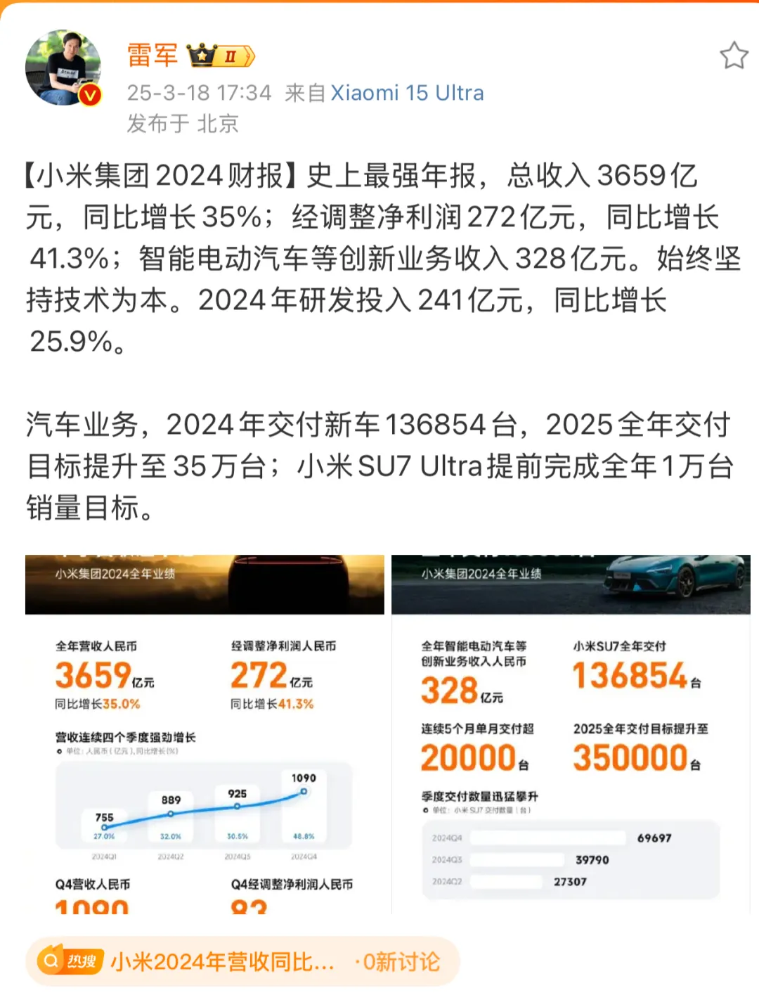 3月18日,小米集团发布2024全年及2024年第四季度财报,创下史上最强年度业绩。财报显示,2024年小米集团总收入同比增长35.0%至人民币3659亿元;经调整净利润同比增长41.3%,达人民币272亿元。