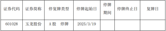 中国经济网北京3月18日讯 玉龙股份(601028.SH)今日晚间发布关于控股股东筹划重大事项申请停牌的公告。公司控股股东正在筹划涉及公司的重大事项,鉴于该事项存在不确定性,为保证公平信息披露,维护投资者利益,避免造成公司股价异常波动,根据《上海证券交易所股票上市规则》等相关规定,经公司申请,公司股票自2025年3月19日起停牌,公司承诺将尽快确定是否进行上述重大事项,并承诺在停牌后3个交易日内复牌。