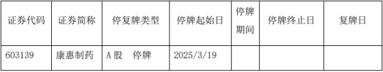 鉴于上述事项正在洽谈当中,尚存在不确定性,为保证公平信息披露,维护投资者利益,避免造成公司股价异常波动,根据《上海证券交易所股票上市规则》、《上海证券交易所上市公司自律监管指引第4号--停复牌》等有关规定,经公司申请,公司股票(证券代码:603139,证券简称:康惠制药)将于2025年3月19日(星期三)起停牌,停牌时间不超过2天。
