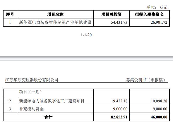 江苏华辰募集说明书显示,本次发行可转换公司债券的募集资金总额不超过46,000.00万元(含本数),扣除发行费用后,募集资金净额将投资于新能源电力装备智能制造产业基地建设项目(一期)、新能源电力装备数字化工厂建设项目、补充流动资金。