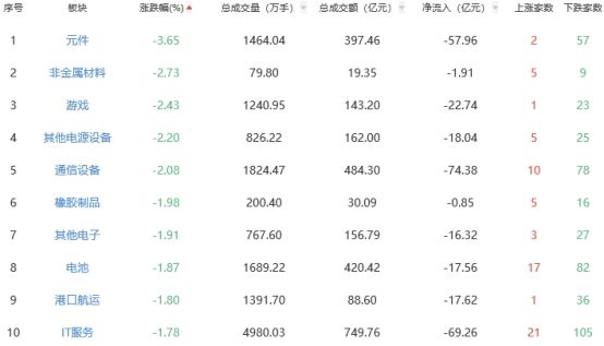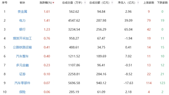 行业板块方面,贵金属、电力、银行等板块涨幅居前,元件、非金属材料、游戏等板块跌幅居前。